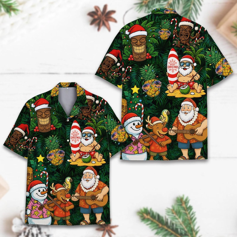 Santa Tiki Christmas In July Hawaiian Shirt Men Women Youth, Tropical Holiday Shirt with Reindeer and Snowman